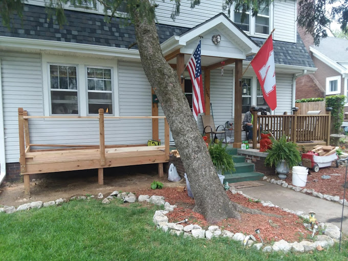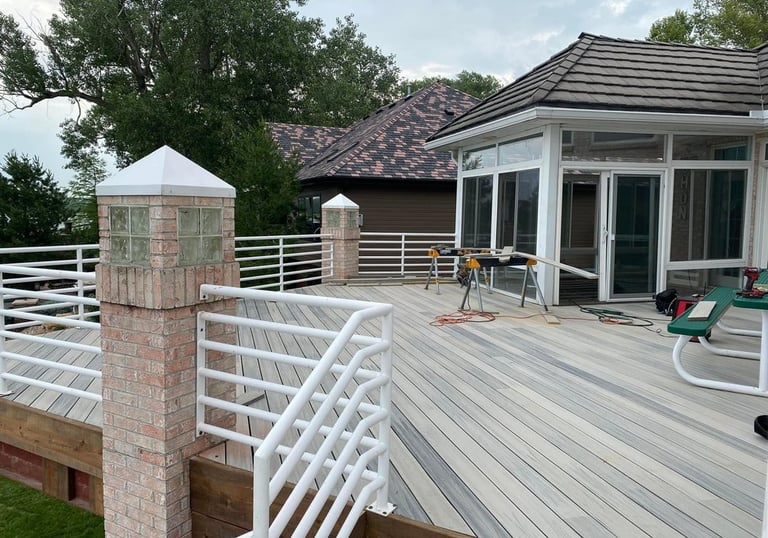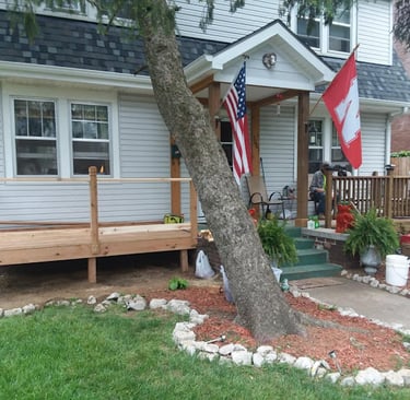 A sturdy, custom wood deck perfect for summer barbecues and family gatherings right in a backyard.